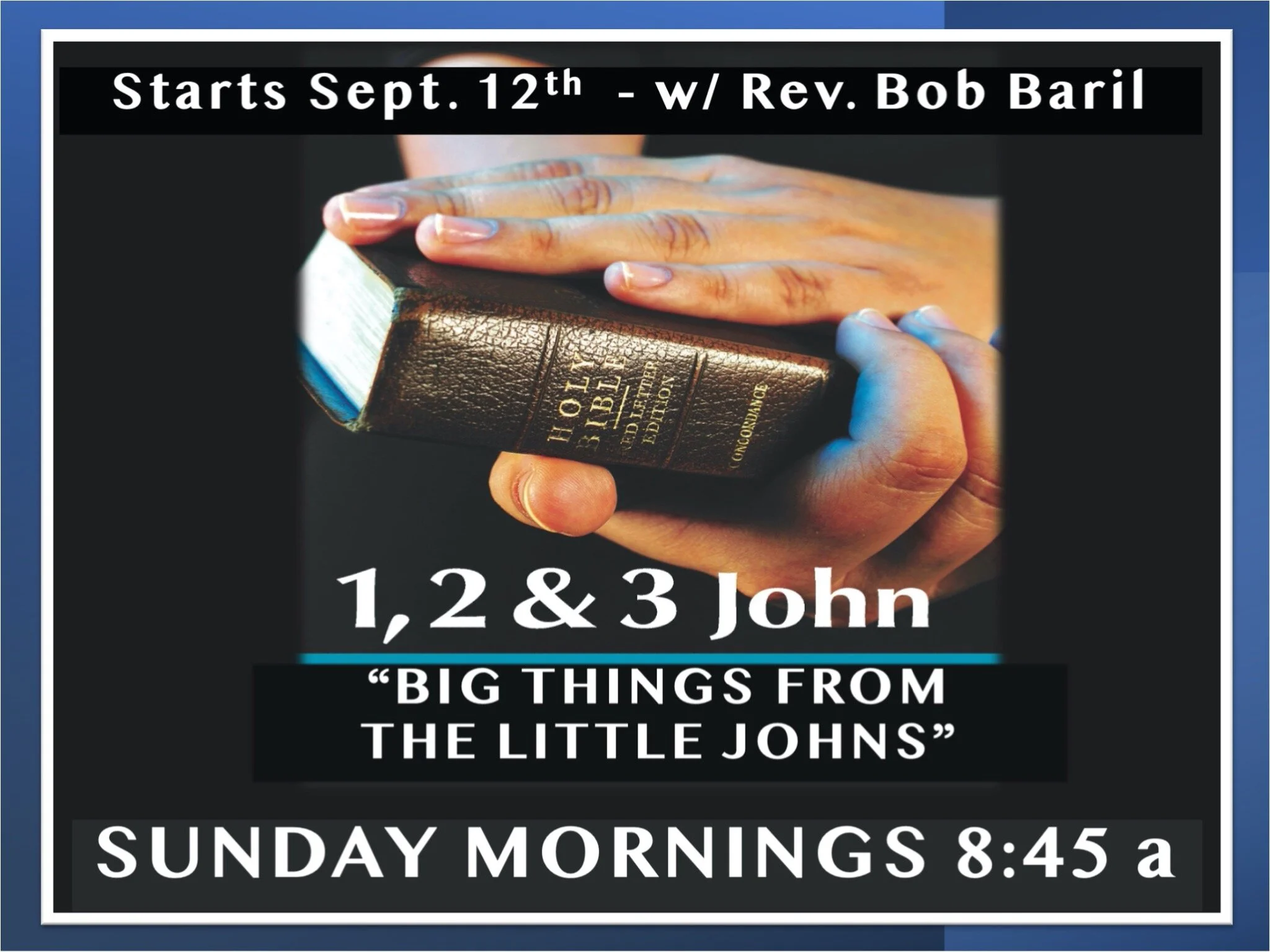 SUNDAY MORNING ADULT BIBLE STUDY Sunday, September 12, 2021 8:45 AM 9:50 AM Google Calendar ICS ADULT BIBLE STUDY - SUNDAY MORNINGS at 8:45 a.m - 1 2 3 John - “Big Things from the Little Johns” - Begins Sunday , Sept. 12th - Sign up at https://breadoflife2.flocknote.com/signup/66356.